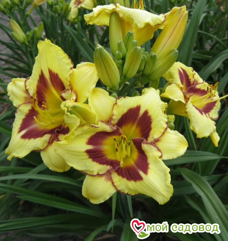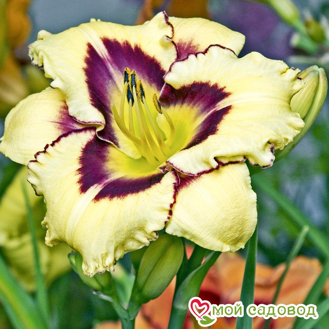 Цветоносы вырастают длиной 70 – 75 см. Прикорневые листья сочные, насыщенно-зеленого цвета. Весь сезон они достойно украшают участок. В полном роспуске диаметр цветков равен 14 см. Лепестки окрашены в желтый цвет. По краям они имеют пурпурную или вишневую кайму, а по центру – густые штрихи такого же цвета. Последние соединяются в центре и образуют «глаз» цветка. Период цветения наступает поздно – первые бутончики раскрываются в конце лета. Длится это удивительное зрелище 30 – 45 дней.